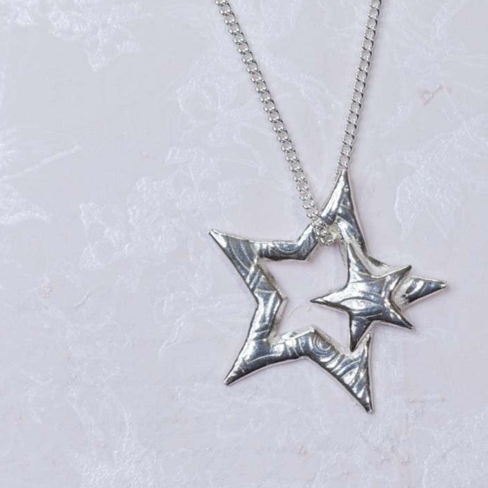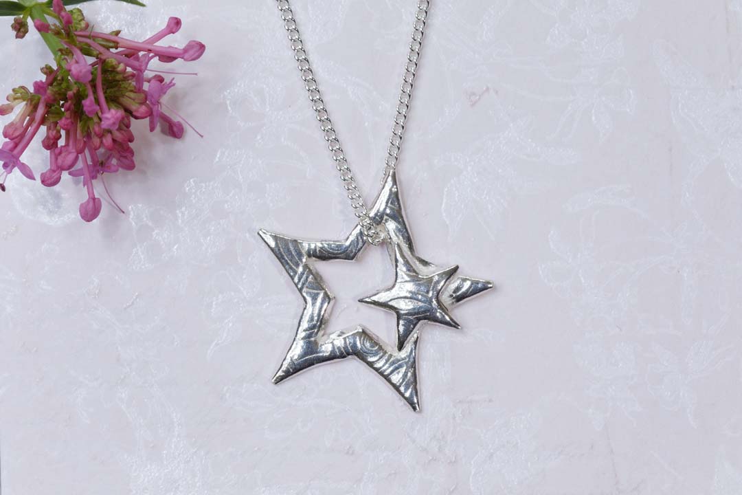 A variation on my Star on Star design. Here I have created a bevelled edge to the textured hollow star (made of fine silver) and similarly, bevelled the edges of the smaller star, again crafted in fine silver which is attached at an angle. I have chosen to attach the sterling silver chain through the hollow of the star which I think looks really pretty.