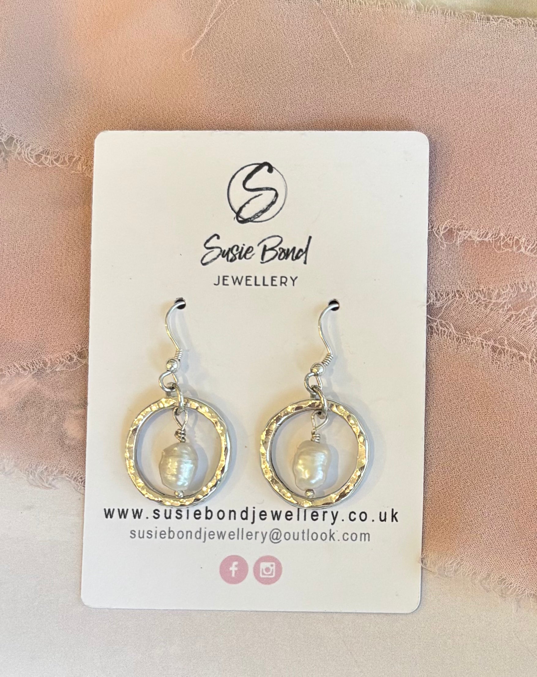 Each Keshi pearl is organically created and each has its own special shape and lustre so I created organic circles of silver, gently hammered to catch the light when worn. Easy to wear with sterling silver wires and perfect for a holiday.