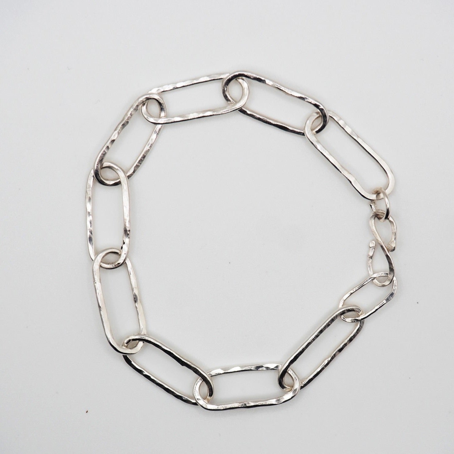 This is a popular contemporary design of a linked bracelet. Each individual link is approximately 20mm in length and handcrafted in sterling silver and I have given each a hammered finish to add an extra twinkle when worn. The bracelet is finished with a handmade S clasp in sterling silver.
