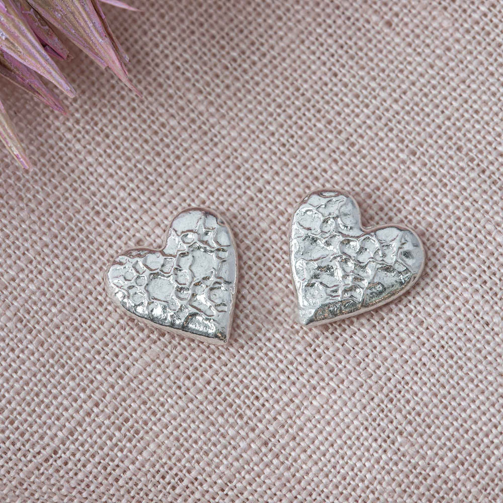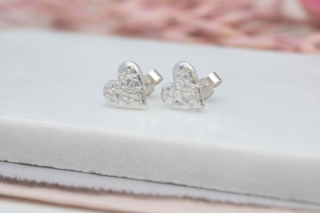 I have been playing around with variations on the theme of heart shaped stud earrings and here is a pair which are dimpled and bubbly and really quite pretty! They are made from fine silver with sterling silver posts and scrolls and have a highly polished finish. I think that they are just the right size for everyday wear. They would also complement the Heart Stacking Ring which is available to order in your size.